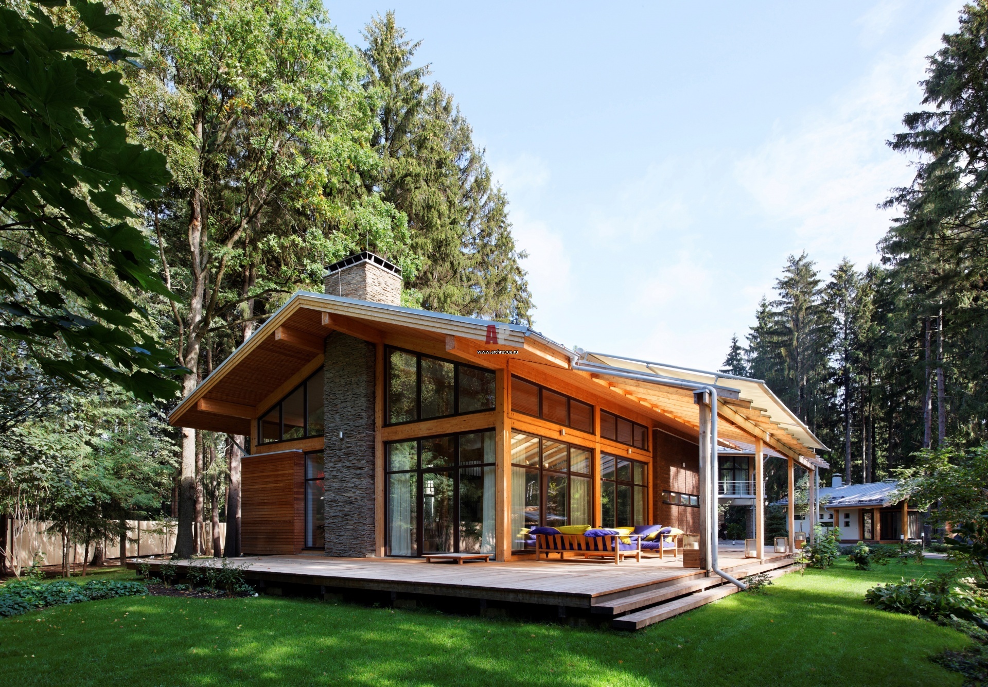 Фасад дома отделан натуральными материалами. Использовалась лиственница, темный кирпич и сланец, напиленный как дикий камень.
