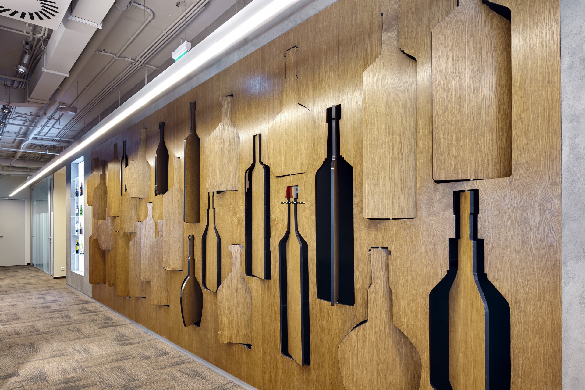 Оформление холла рабочего этажа. Одна из стен превращена в арт-объект. Она зашита деревянными панелями, в которых прорезаны объекты. Благодаря конструкции на металлических стержнях они вращаются.