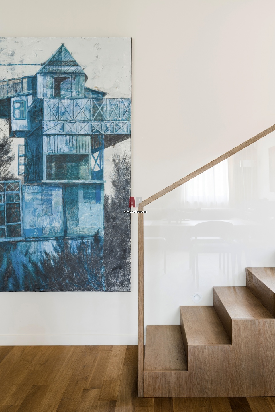 Выход на террасу. На стене – картина «Голубятня» работы Екатерины Рожковой. Лестница, МДФ со шпоном дуба.