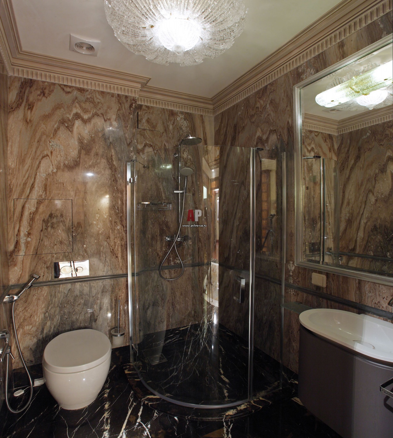 На фото – полы и стены ванной комнаты облицованы мрамором бежево-розового цвета. В тон с ними выкрашены лепные потолочные карнизы. Угловая душевая кабина из прозрачного стекла. Унитаз, Villeroy & Boch.