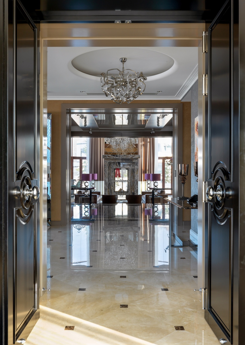 Парадная входная группа. Пол облицован плиткой из мрамора Crema Morfil (600х600х20) со вставками мрамора Emperadoк Dark (70х70х20).