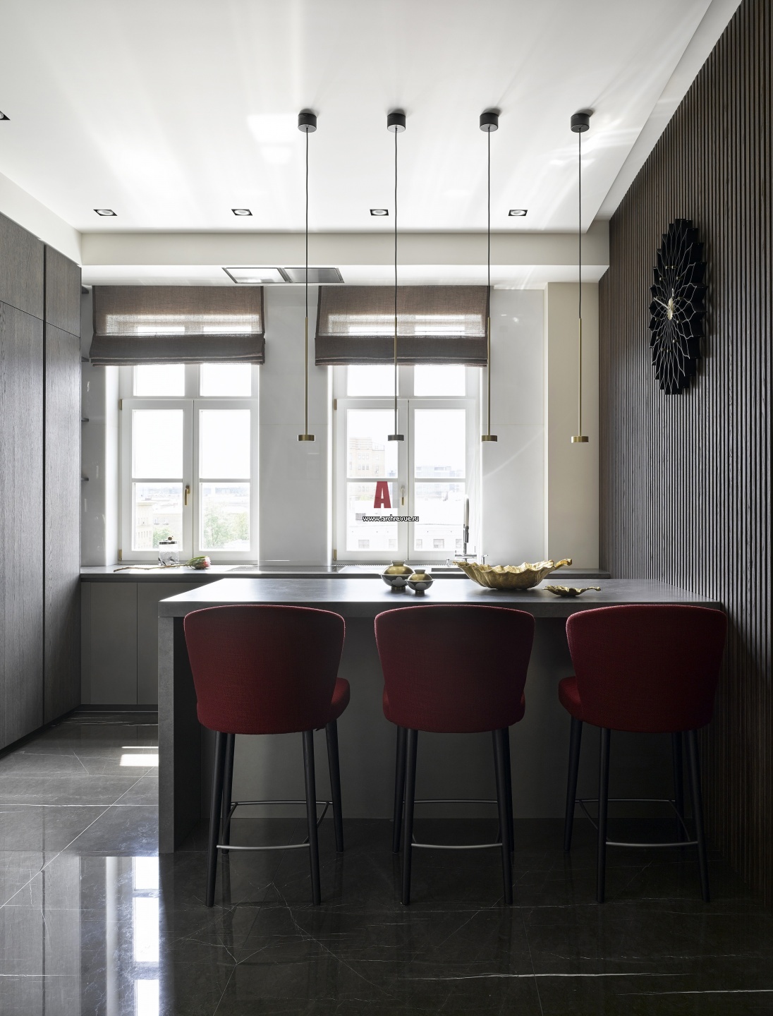 Кухня, хотя и объединена с гостиной, максимально удалена от зоны отдыха и обособлена обеденной зоной. Стена напротив встроенного гарнитура оформлена реечными панелями из темного дерева, изготовление «Ассоциация русских мастеров».