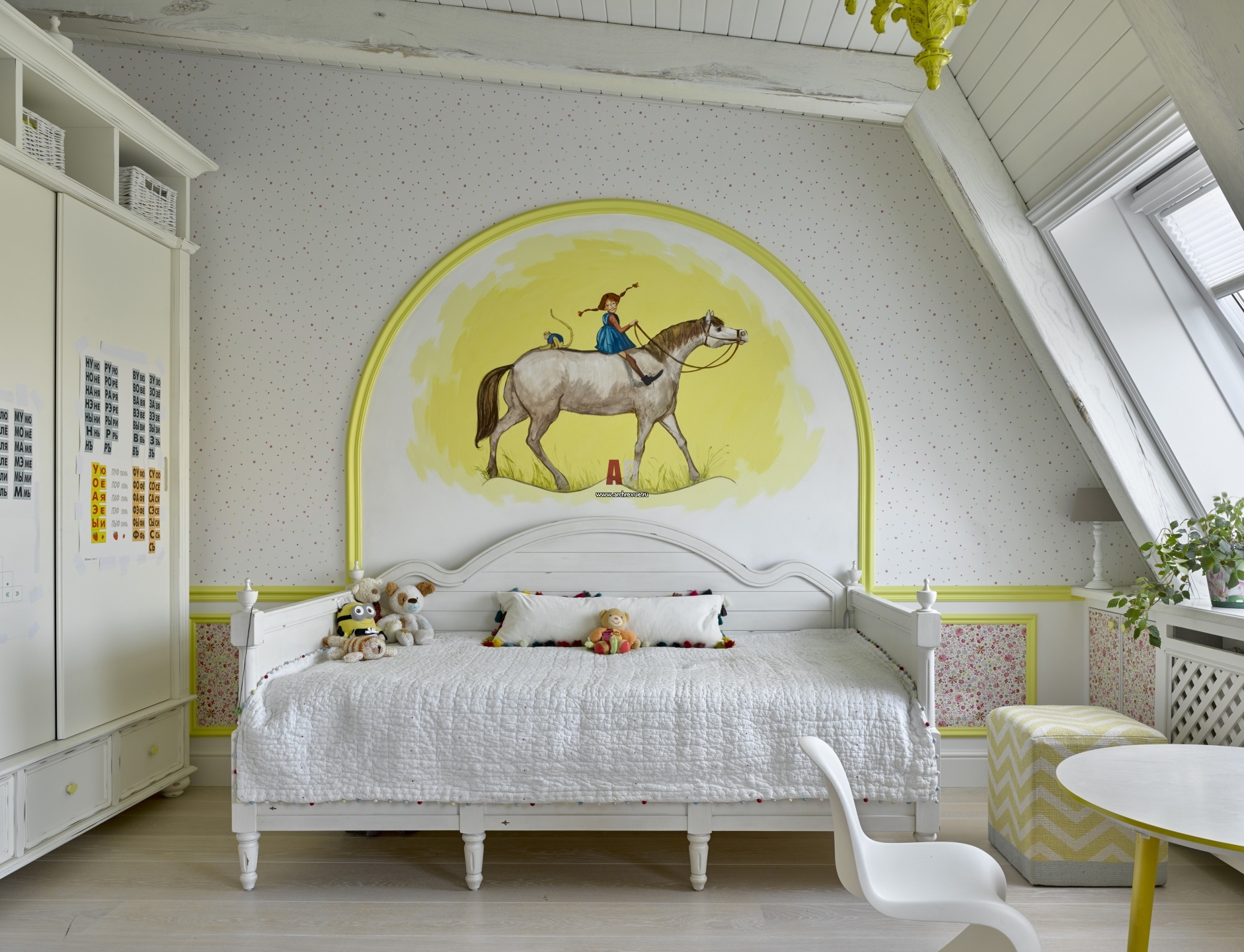 Детская комната младшей дочери – место радости. Интерьер решен в светлых, солнечных тонах. Над кроватью – роспись с изображением Пеппи-Длинный Чулок. Белый шкаф выполнен по эскизу автора проекта. Кровать, Restoration Hardware. Покрывало, Anthropologie. Роспись, Лиза Хломова.