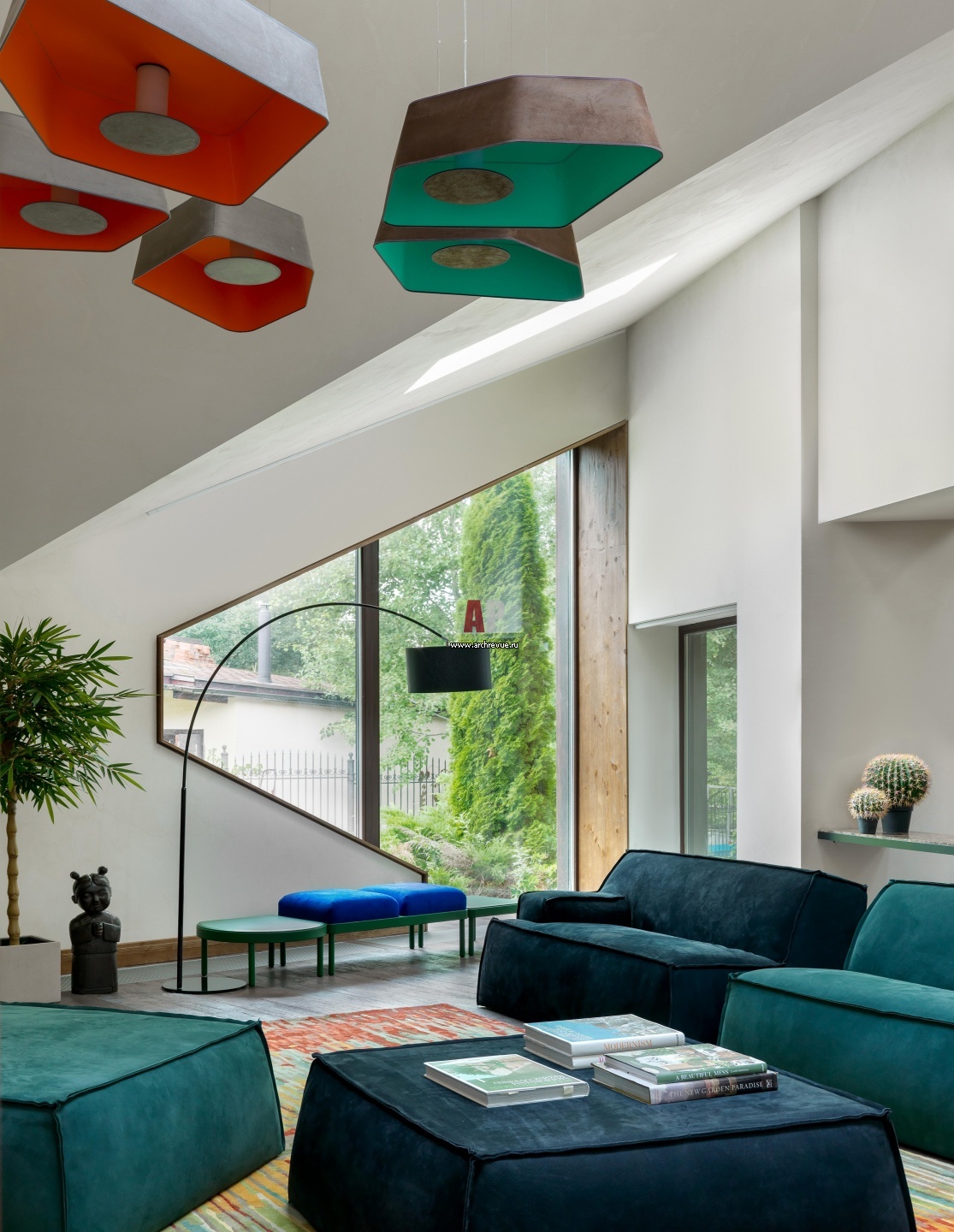 Авангардное шале с этническими мотивами и разноцветной мебелью. Мягкая мебель и металлический журнальный столик, Baxter. Подвесной светильник, Design Heure.