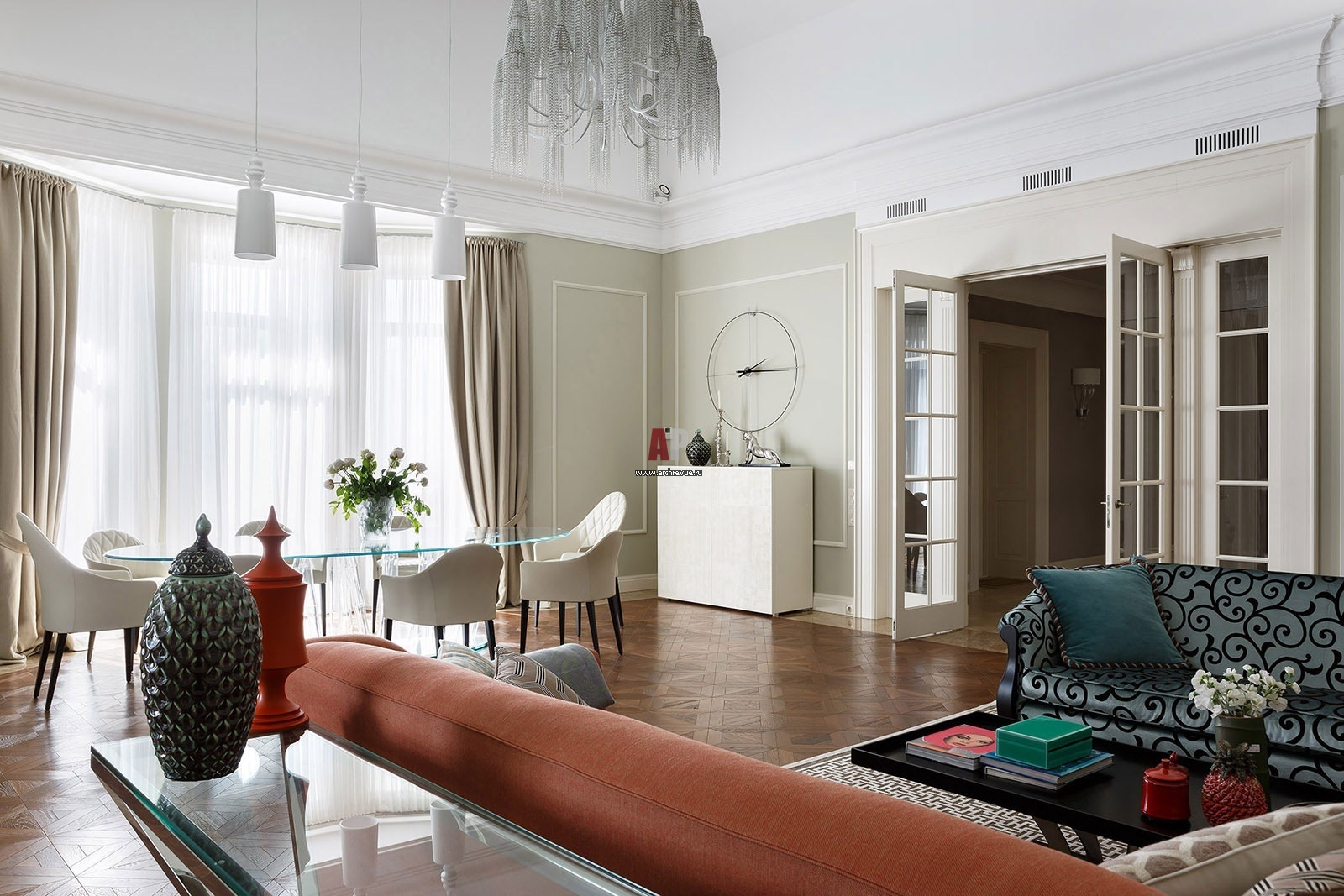 Дом в пастельных тонах под Санкт-Петербургом. Интерьер гостиной в стиле современная классика.