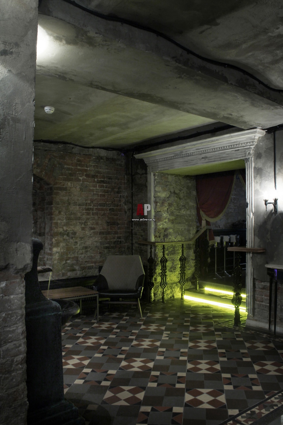 Входная зона клуба. Широкий дверной проем украшен лепным порталом, изготовление «Астмал Декор». На полу – панно из метлахской плитки.