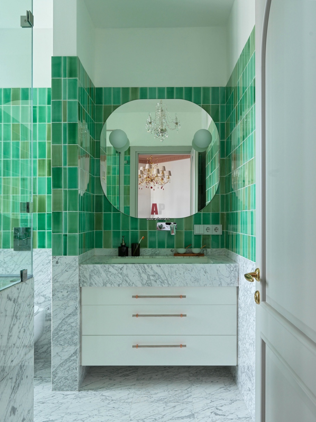 Ванная комната при хозяйской спальне. Пол и нижняя часть стен облицованы каррарским мрамором. Верхняя часть стен оформлена плиткой ручной работы изумрудно-зеленого цвета, Meraki Tiles.