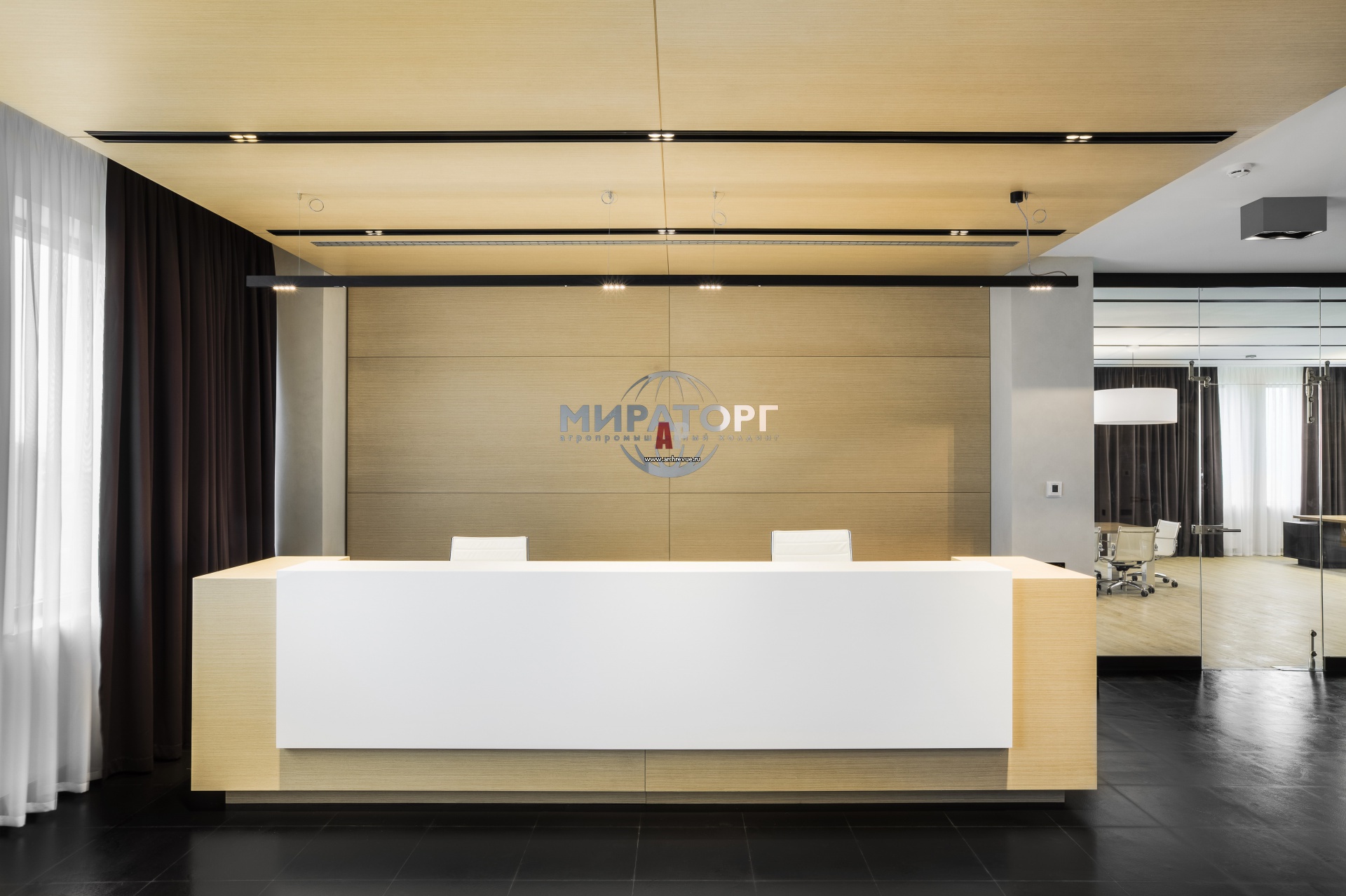 Приемная с рецепцией на VIP-этаже руководства. Стойка ресепшен, потолки зашиты панелями из светлого дерева.