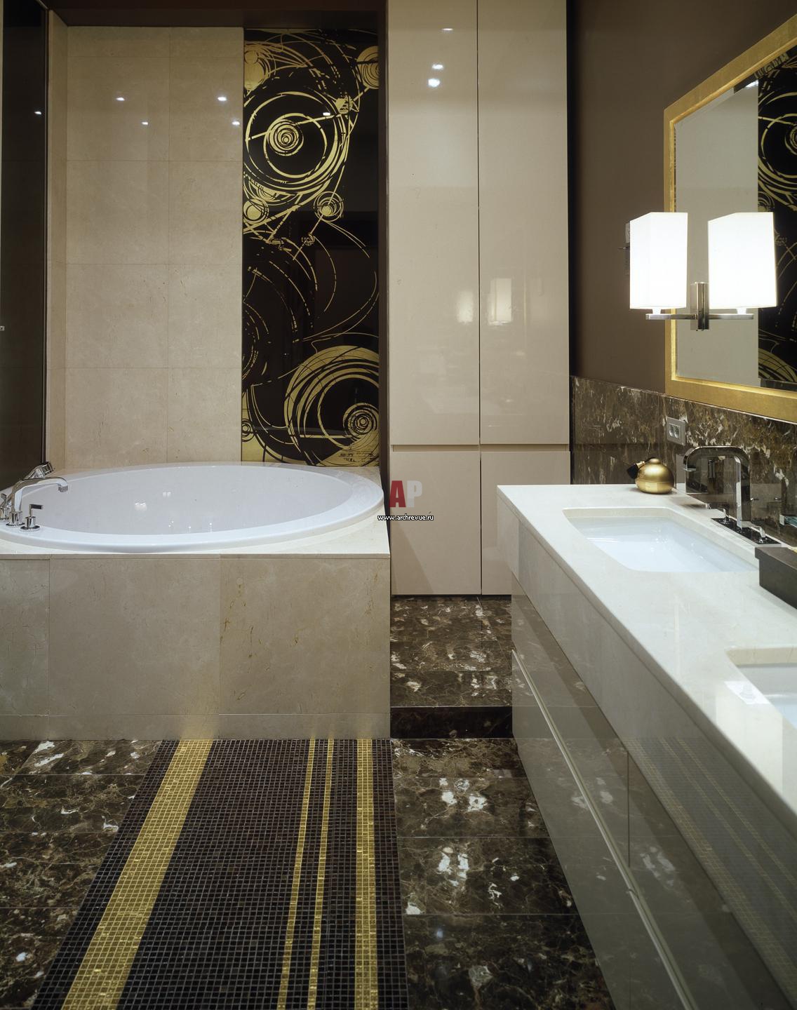 Акцент хозяйской ванной комнаты – стеклянная панель, изготовитель Stiv TS , с золотым узором. Художник Б.Бельский. К ней ведет выложенная мозаикой золотая дорожка на полу.