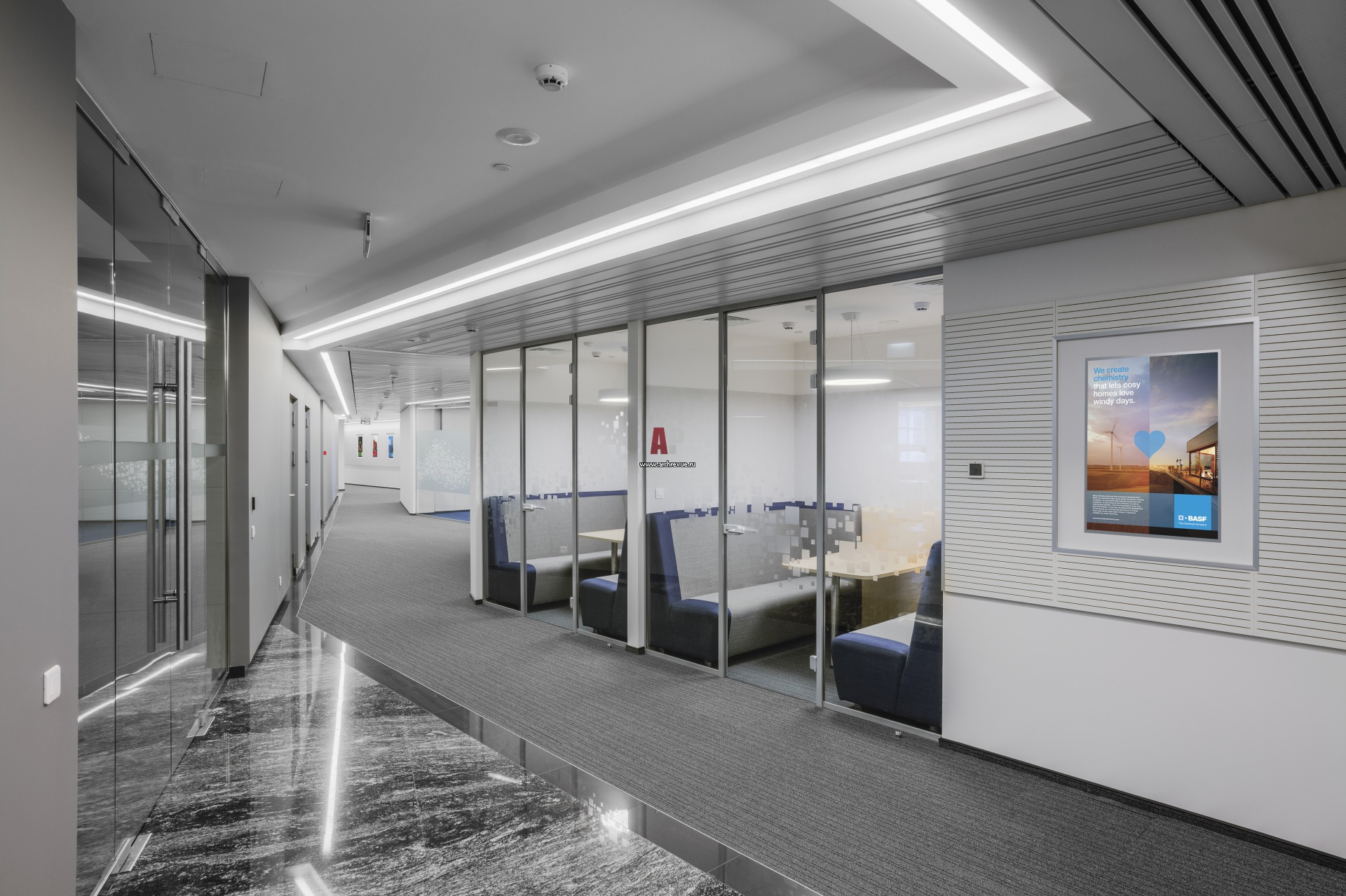 Офис имеет динамичную планировку с перетекающими, но вместе с тем визуально изолированными пространствами. Рабочие пространства зонированы с помощью стеклянных перегородок.