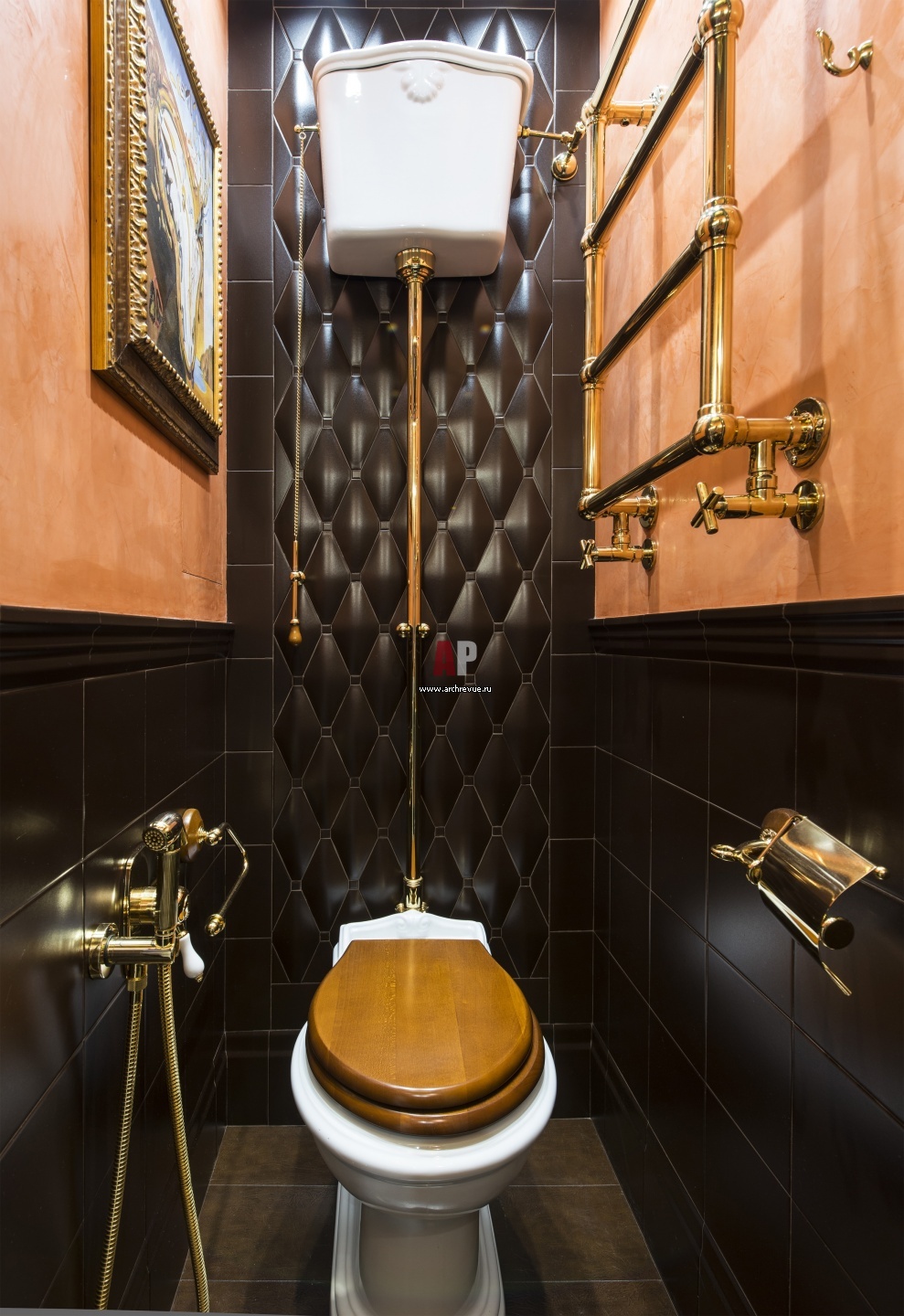 Небольшой гостевой санузел исполнен в ярких цветах и театральной стилистике. Терракотовые стены частично облицованы керамической плиткой оттенка горячего шоколада с имитацией каретной стяжки. Фурнитура LineaTre в золотом исполнении.