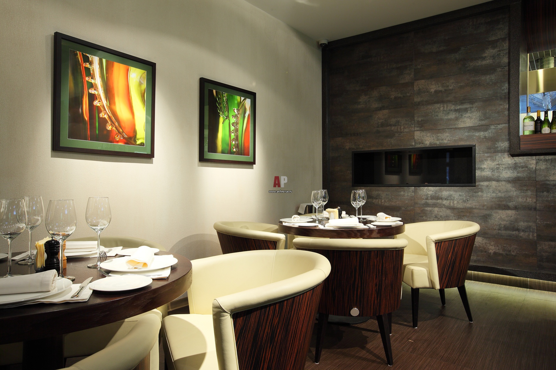 Фрагмент зала ресторана. Стена облицована керамогранитом, имитирующим сланец. В нее вмонтирован биокамин Biofactory. Полукруглые кресла, отделанные шпоном макасара, Domitalia (Италия).