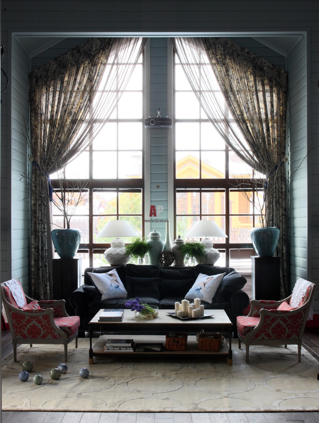 Интерьер гостиной. Шторы для гостиной сшиты из тонкого серого льна с крупными розами от Andrew Martin. Они стали отправной точкой для линии кантри.
