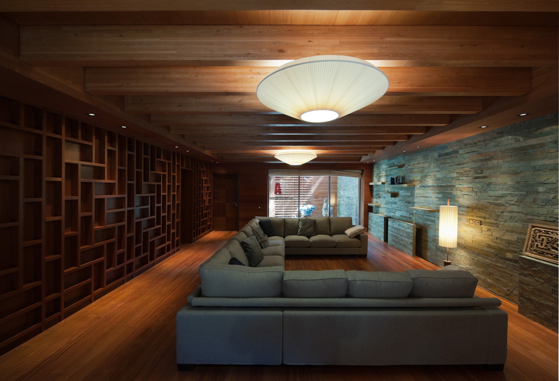 Зона отдыха в цокольном этаже. Балочный, деревянный потолок. Светильники напоминают бумажные китайские фонари.