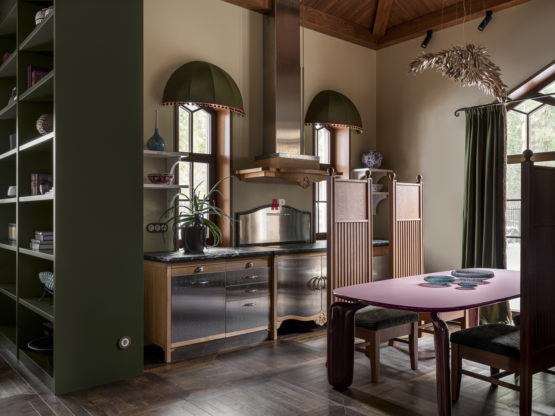 Кухня. Кухонный гарнитур в стиле необарокко с фасадами из нержавеющей стали, Marchi Group. Интересно оформлены окна – маркизы сделаны внутри помещения.