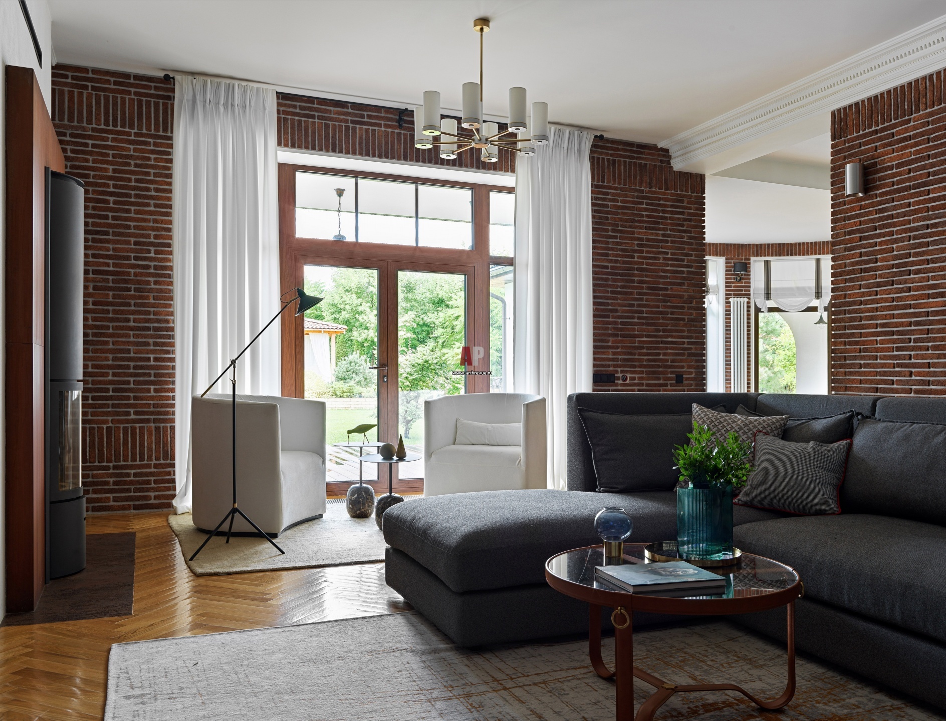 Общественная зона многофункциональная. Возле окна находится зона отдыха с белыми креслами. Винтажные кресла, Formanova, дизайн Giulio Moscatelli, Италия, 1960 г.