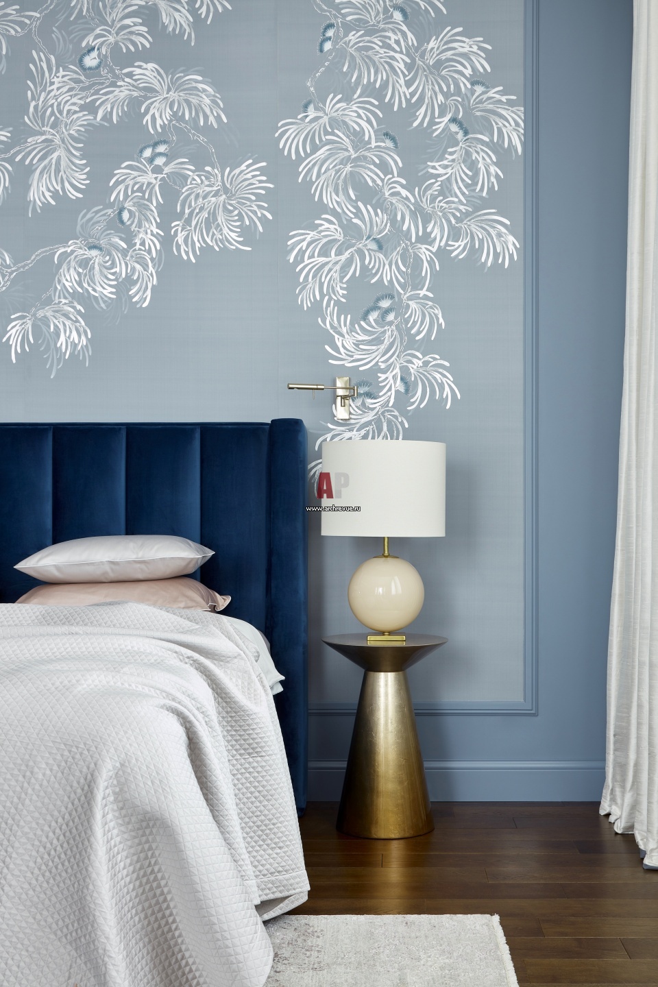 Хозяйская спальня. Шелковое панно с ручной росписью, De Gournay. Изголовье кровати, синий бархат. Портьеры, дикий шелк, JAB.