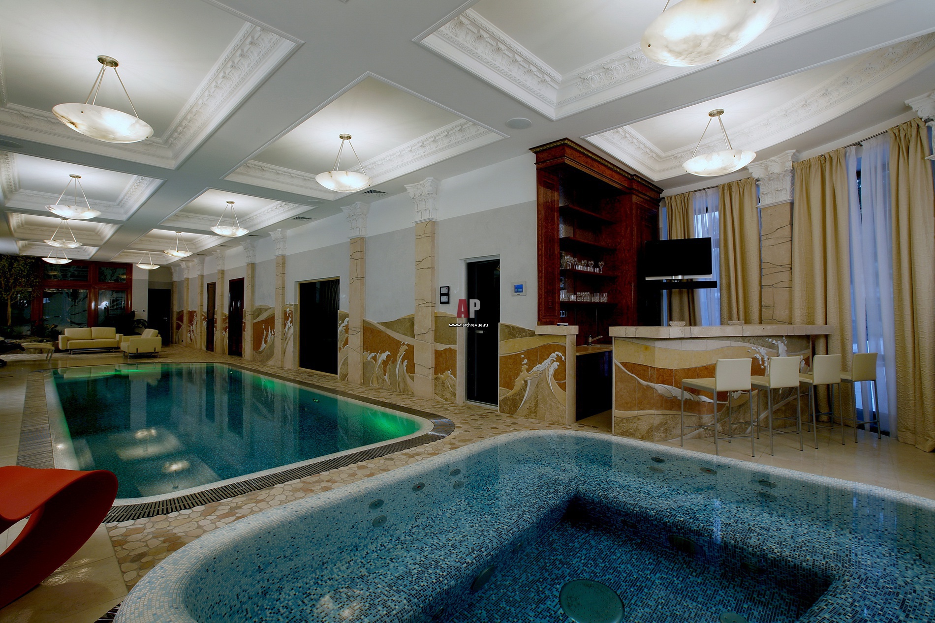 Бассейн в средиземноморском стиле. Он состоит из плавательной дорожки и купели с гидромассажем. Стены облицованы натуральным камнем, инкрустация в виде прибрежных волн.