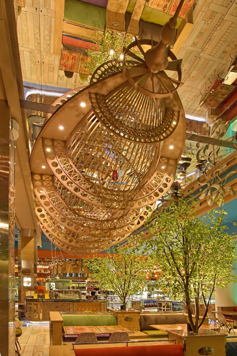 Домината главного зала - 13-метровая модель дирижабля, набранная из 3D-паззлов. Дирижабль, подсвеченный декоративными металлическими светильниками в стиле фантастических романов Жюля Верна, парит под высоким потолком в центре пространства.