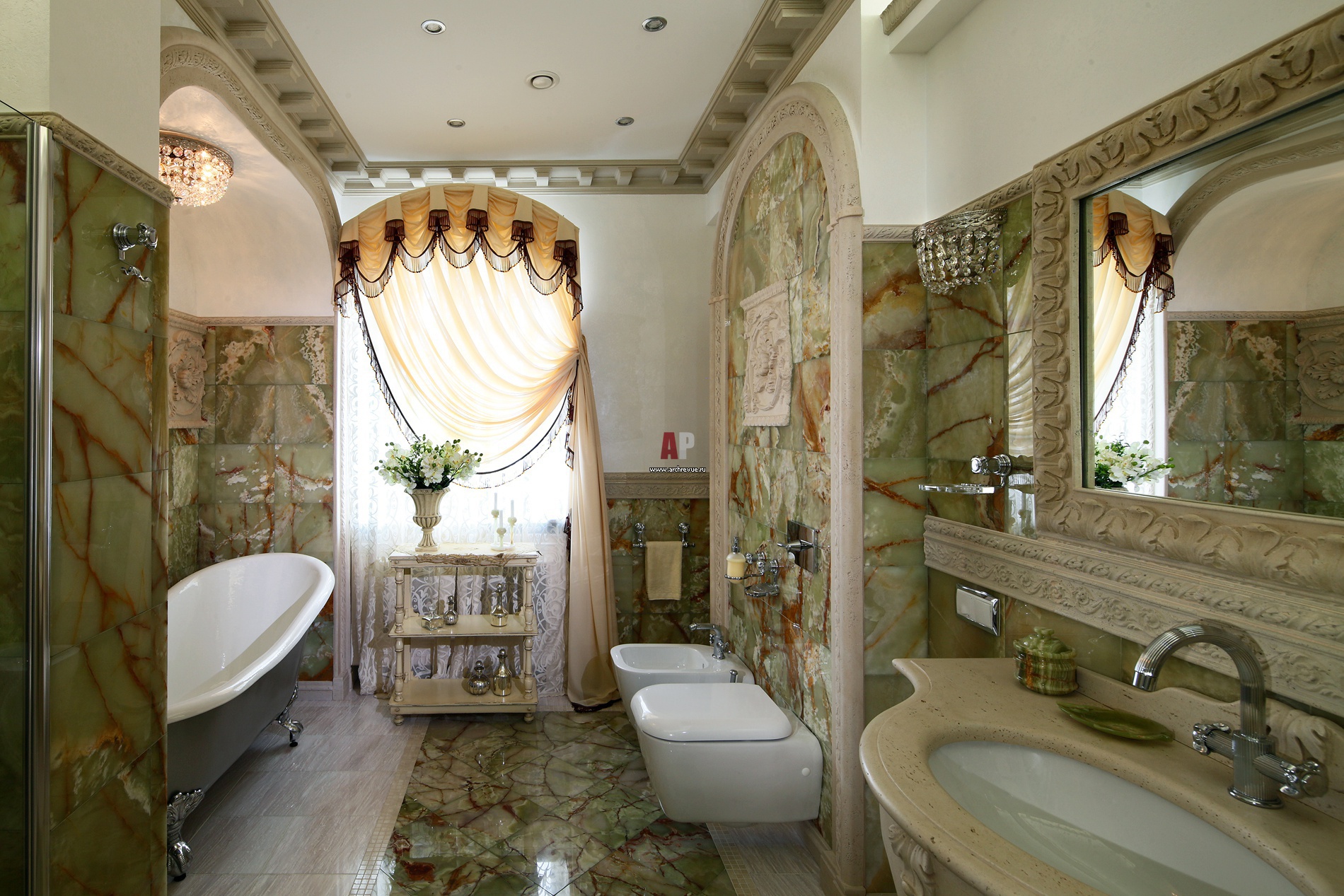 Гостевой санузел в классическом стиле. Стены и пол оформлены мрамором и зеленым ониксом. Рама зеркала, столешница и тяги на колоннах сделаны из каменного декора фабрики Tecno Art Marmi .