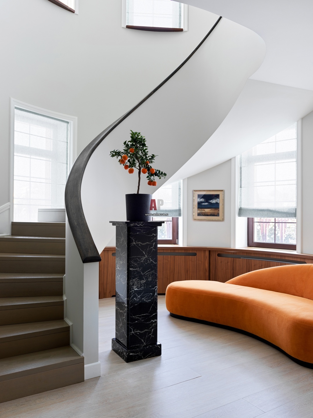 Прихожая с винтовой лестницей. Оранжевый бархатный диван, Montbel. Каменный пьедестал, Eichholtz. Половое покрытие из керамогранита осталось от предыдущих владельцев.