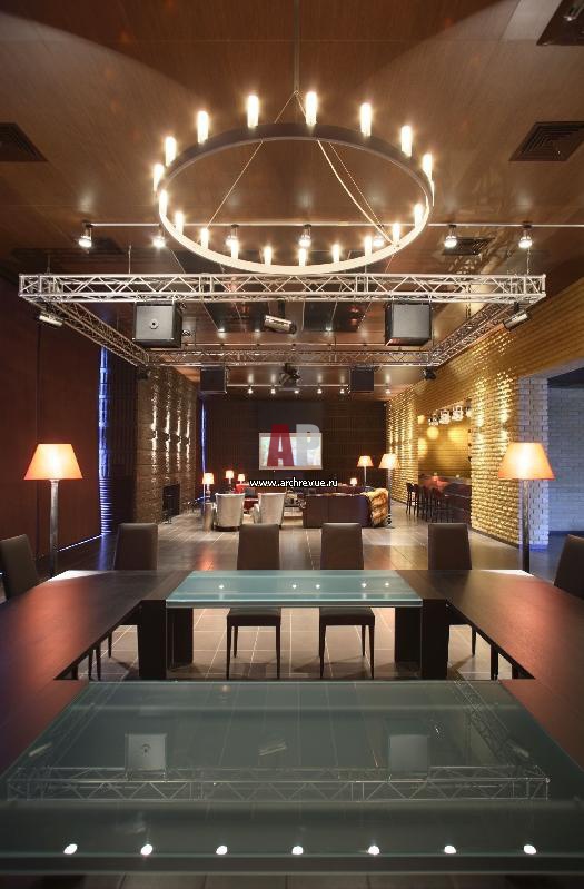 Столовая зона соседствует с танцполом. Танцевальная зона снабжена колонками, вмонтированными в потолок в виде черной платформы. Направленный поток звука позволяет с одной стороны обеспечить высокий уровень звучания на небольшой площадке, а с другой, комфортно разговаривать, расположившись в соседней каминной зоне. Домашний кинотеатр, дискотека — поставщик ABL - engineering group