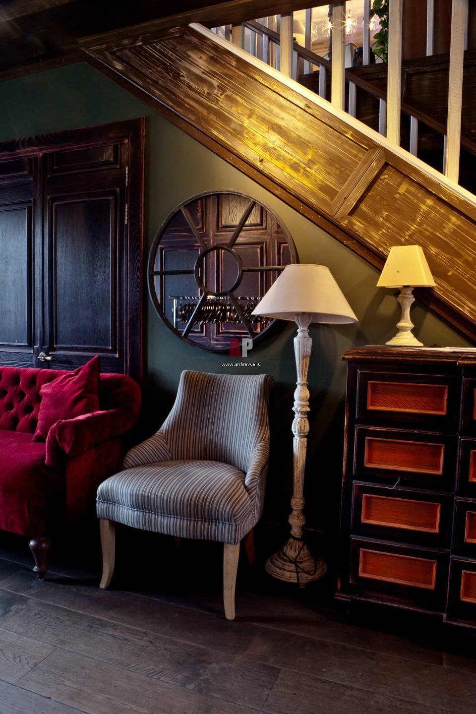 Зона отдыха под лестницей. Стул в полосатой обивке, поставщик NEXXT.