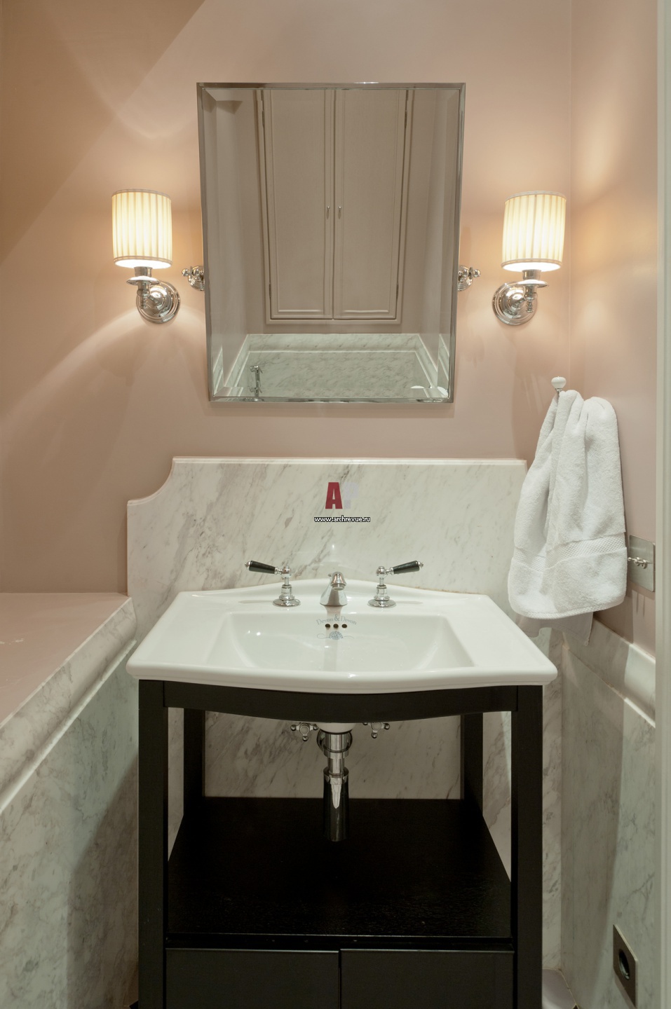 Черно-белый гостевой санузел. Низ стен по периметру помещения облицован белым с серыми прожилками мрамором. Умывальник из венге, раковина, Villeroy & Boch.