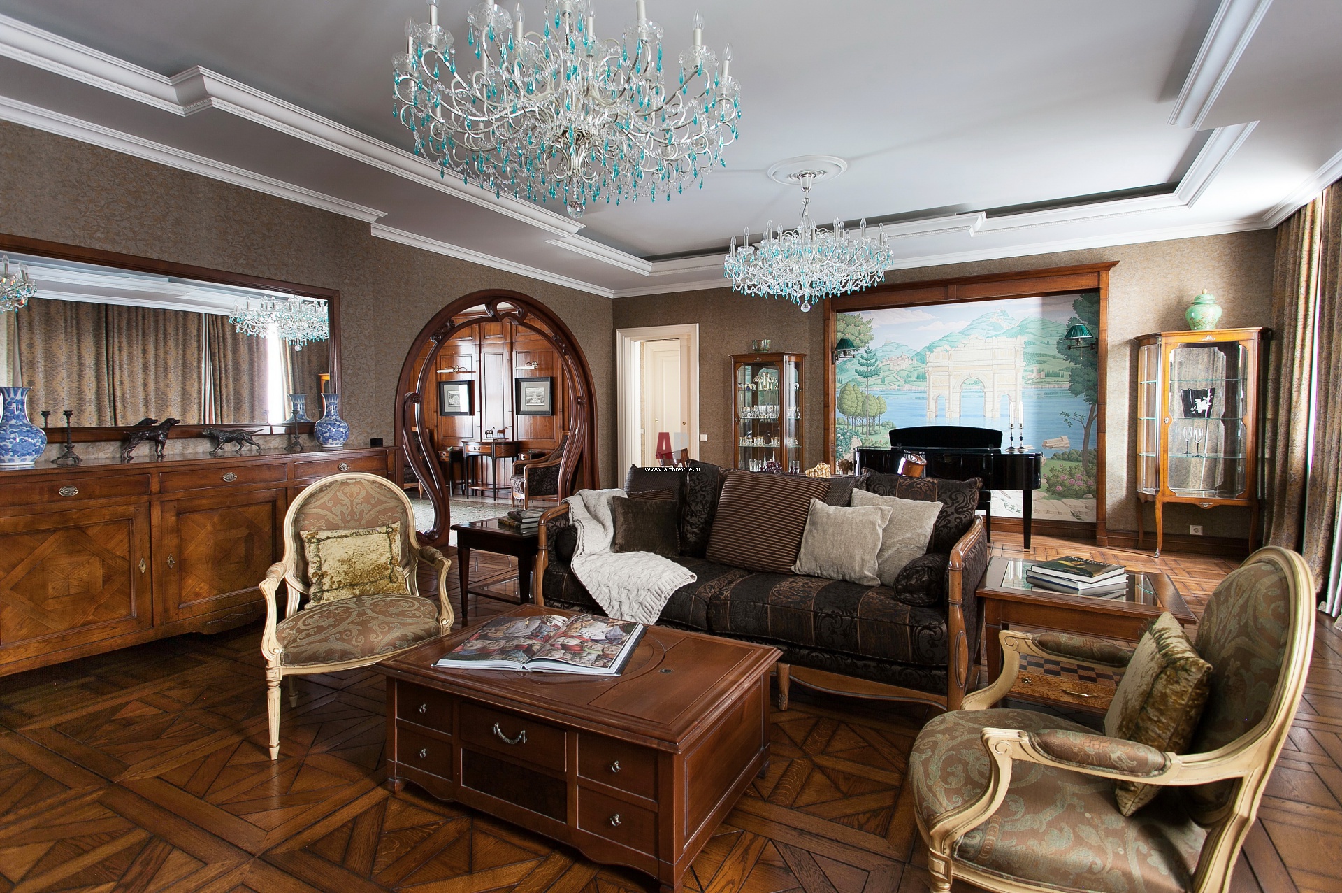 Гостиная имеет плотную, темно-шоколадную с красными сполохами колористику. Французский модульный паркет, корпусная мебель, индивидуальные столярные изделия выполнены из массива и шпона вишни. Шторы и обои решены в бежево-шоколадной гамме.