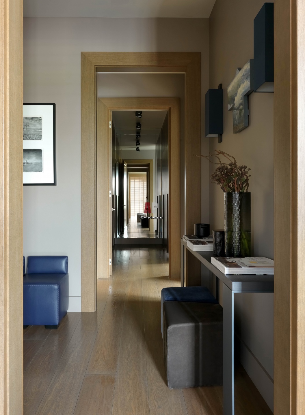 Квартира с природными мотивами. Интерьер прихожей. Стены выкрашены в теплый бежевый оттенок. На полу, как и во всех жилых помещениях – массивная доска из светлого дуба. Консоль, PH Collection. Пуфы, Marie's Corner. Светильники, Stephane Davidts.