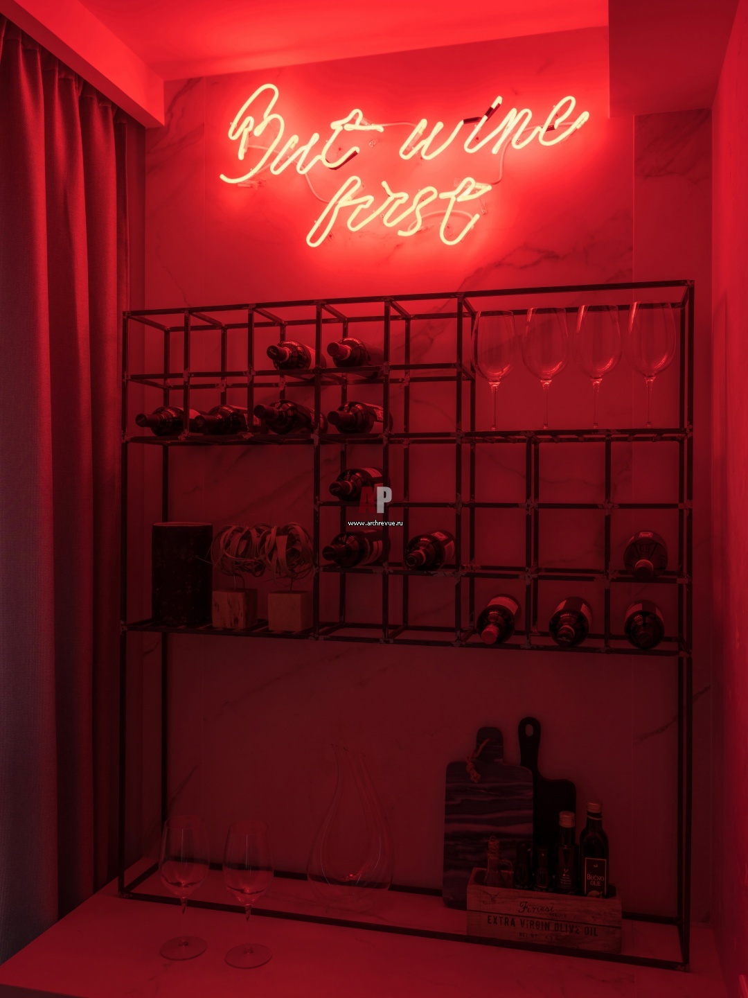 Винотека на балконе с панорамным видом на «Москва-Сити». Красная подсветка и сияющая неоновая надпись «But win first» создают в московской квартире атмосферу апартаментов в Нью-Йорке.