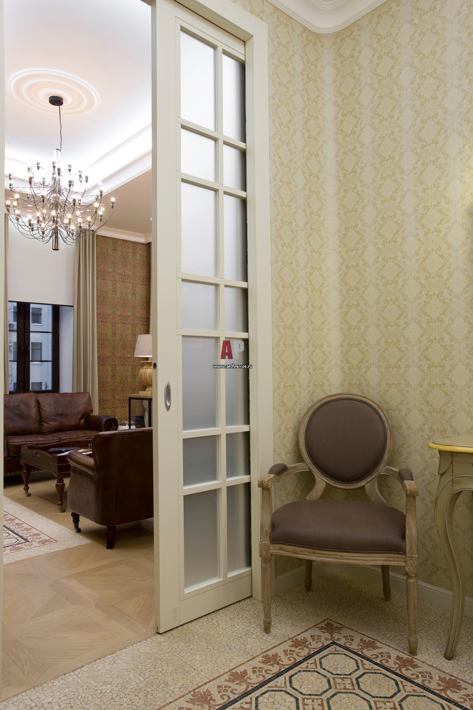 Вид из прихожей на гостиную. Раздвижные двери в стиле классического оформления интерьеров. Полотна из матового стекла в каркасе из белого дерева с тонкими переплетами.