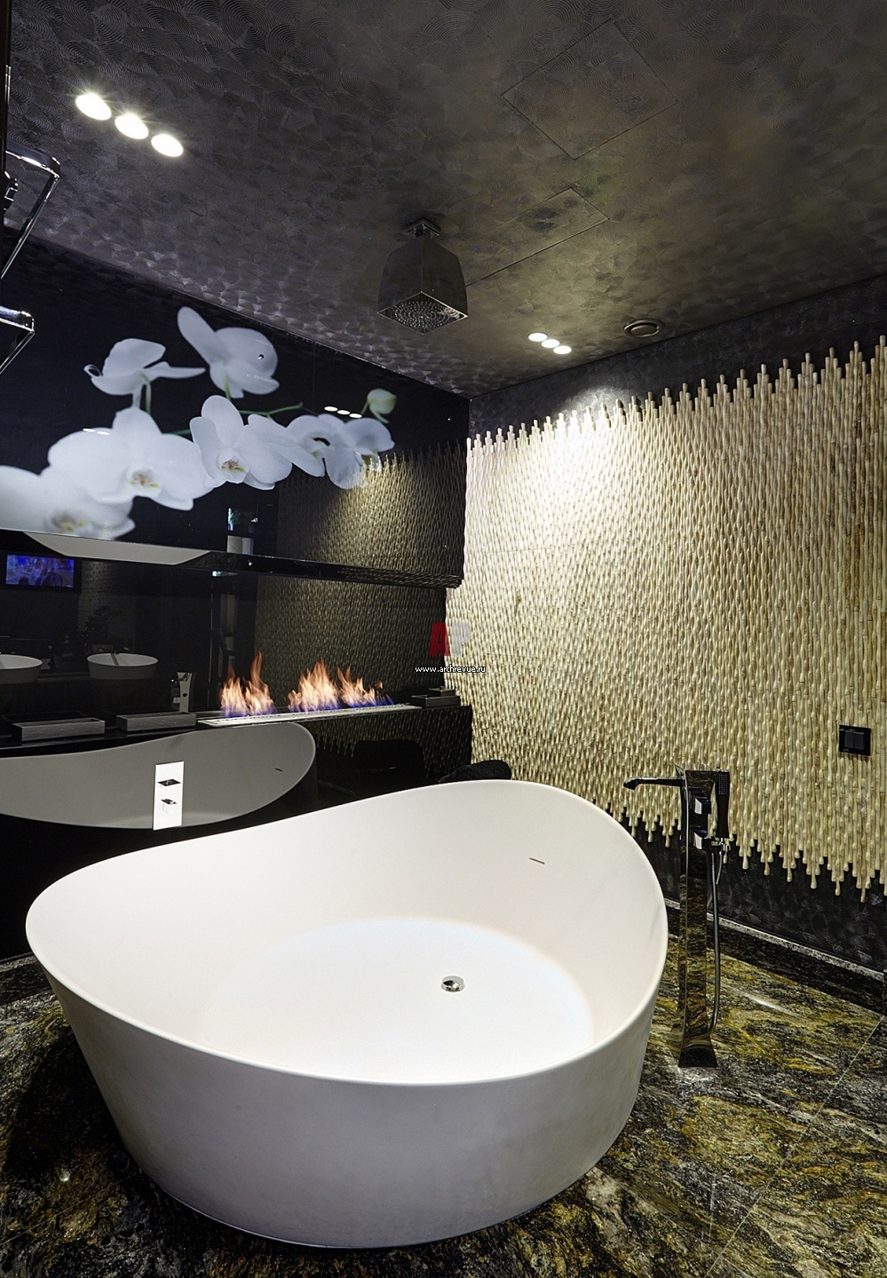 Стены ванной комнаты облицованы черным стеклом и травертином. Панно с изображением белых орхидей выполнено в технике многослойной печати на стекле.