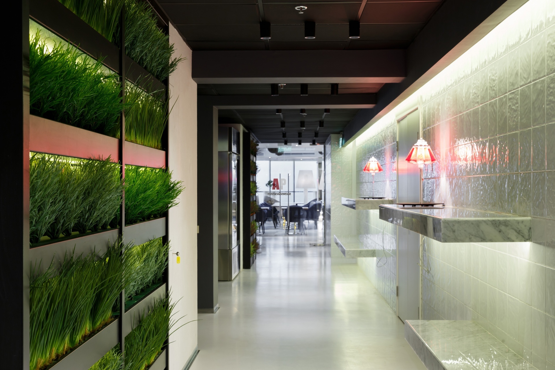 Холл оформлен стеллажами, где выставлены кадки с живыми растениями.