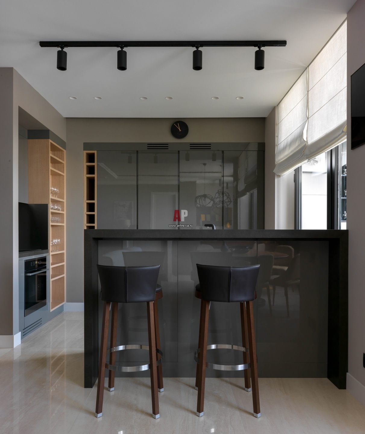 Кухня с островом расположена по другую сторону от диванной группы. Кухонный гарнитур с островом выполнен в сером глянце, столешницы, фартук – тонкий керамогранит с фактурой камня.
