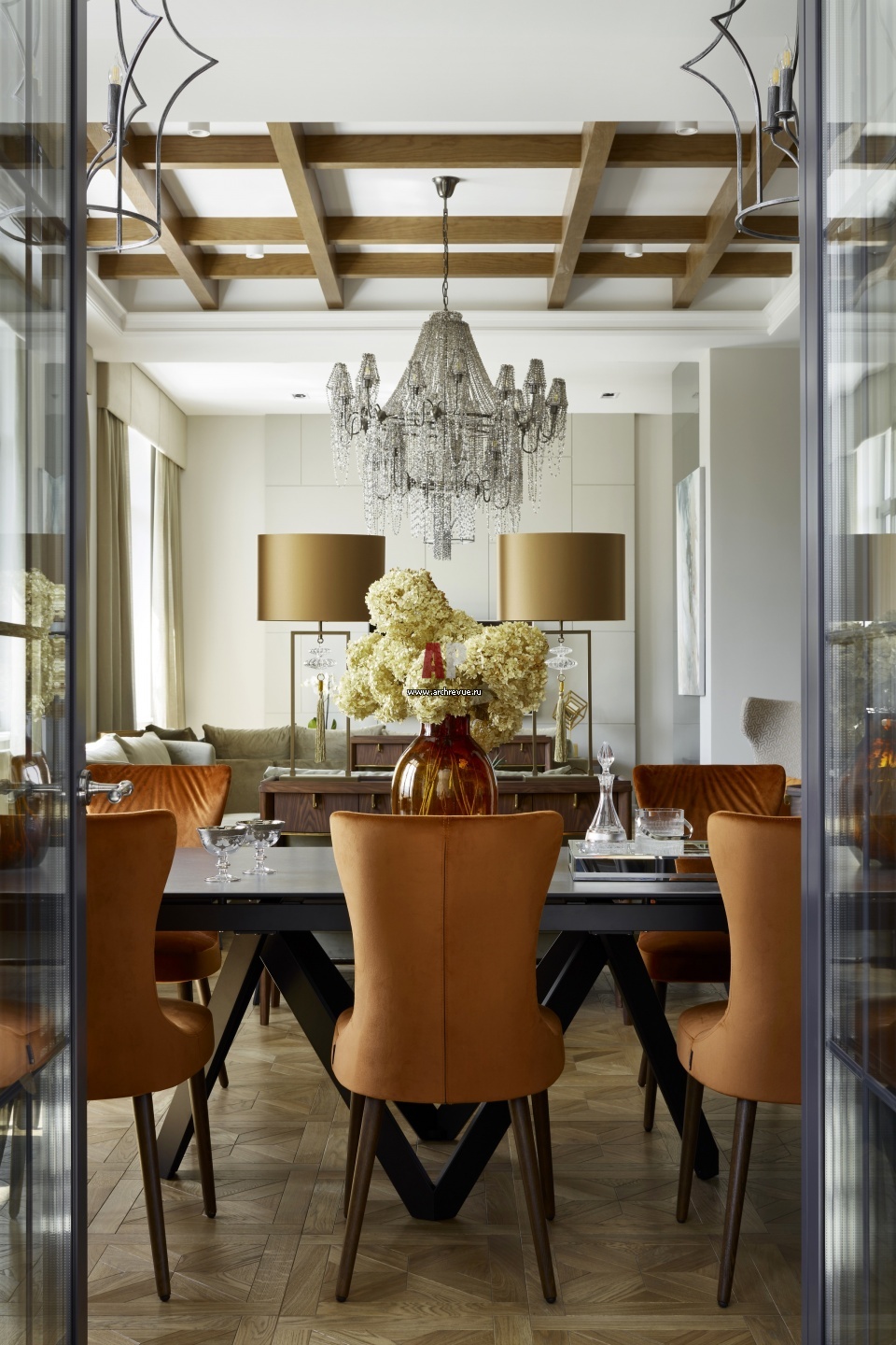 Квартира в Алма-Ате в эклектичном европейском стиле. Вид из столовой на гостиную и зону ТВ.