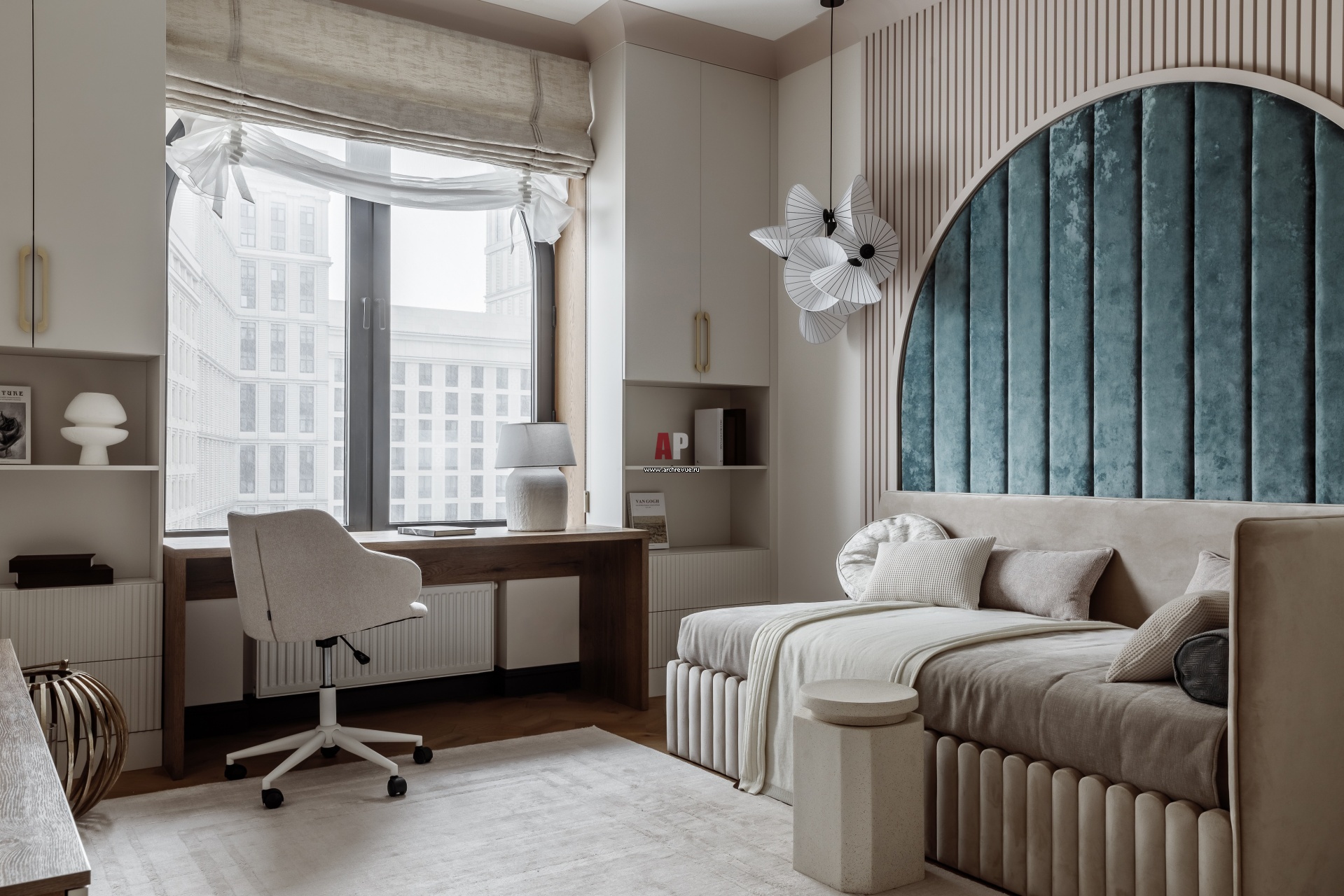 Акцент детской дочери – арочное панно за изголовьем кровати и декоративное оформление композиции – реверанс в сторону арочных оконных проемов в окружении поясов из пилястр
