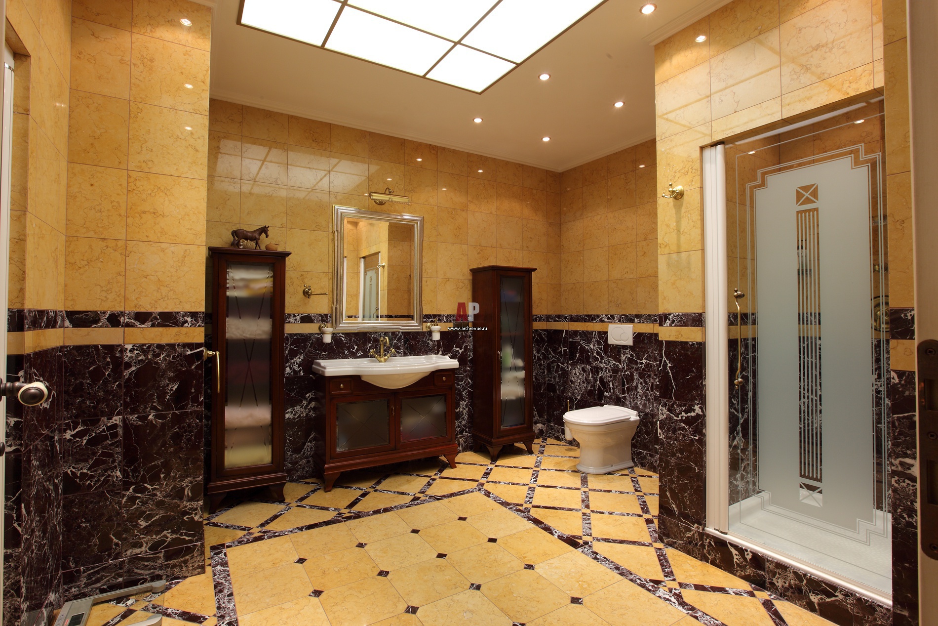 Главный санузел целиком облицован мрамором двух видов Rosso Levanto (светлые прожилки на насыщенном бордово-коричневом фоне) и Crema Valencia. Он считается одним из самых красивых сортов мрамора жёлтого цвета.