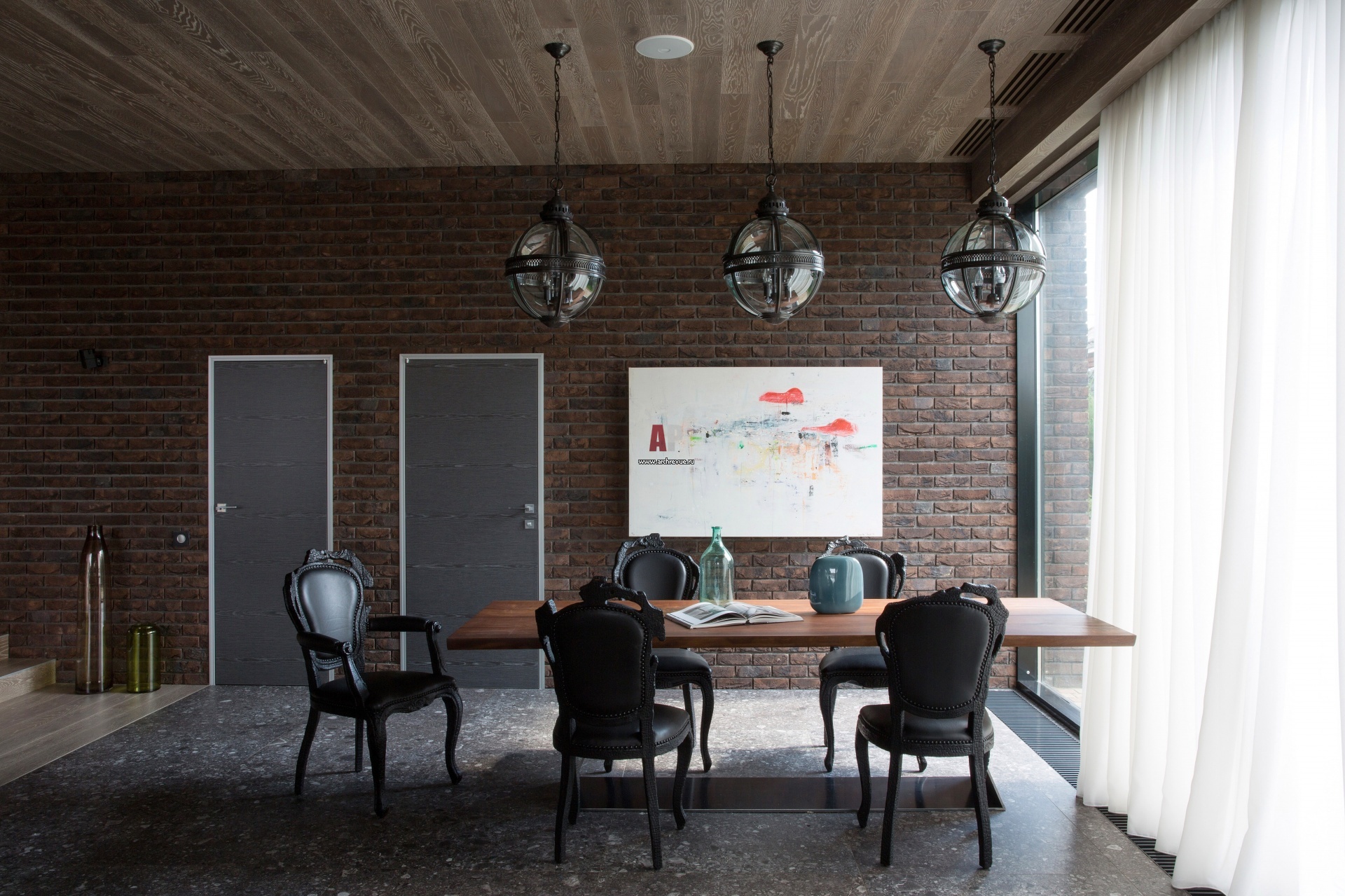 Интерьер столовой в доме с открытой кирпичной кладкой стен. Обеденный стол, Riva 1920. Черные «обугленные» стулья, MOOOI.