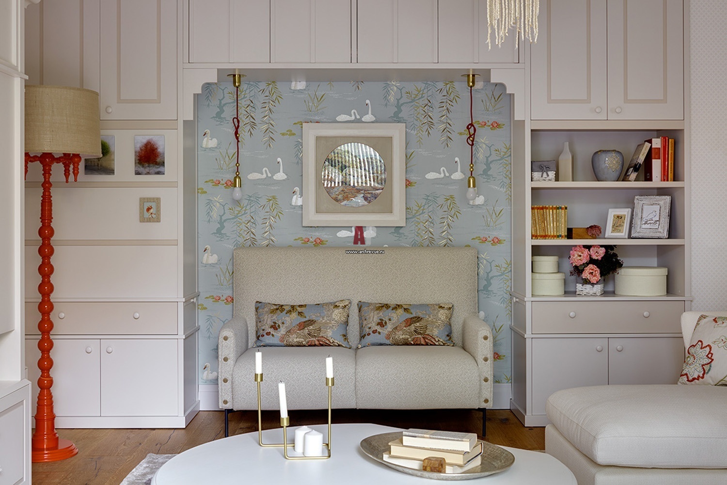 Мягкая зона в гостиной. В нишу установлен диван, Tacchini. Голубые обои с лебедями из Англии.
