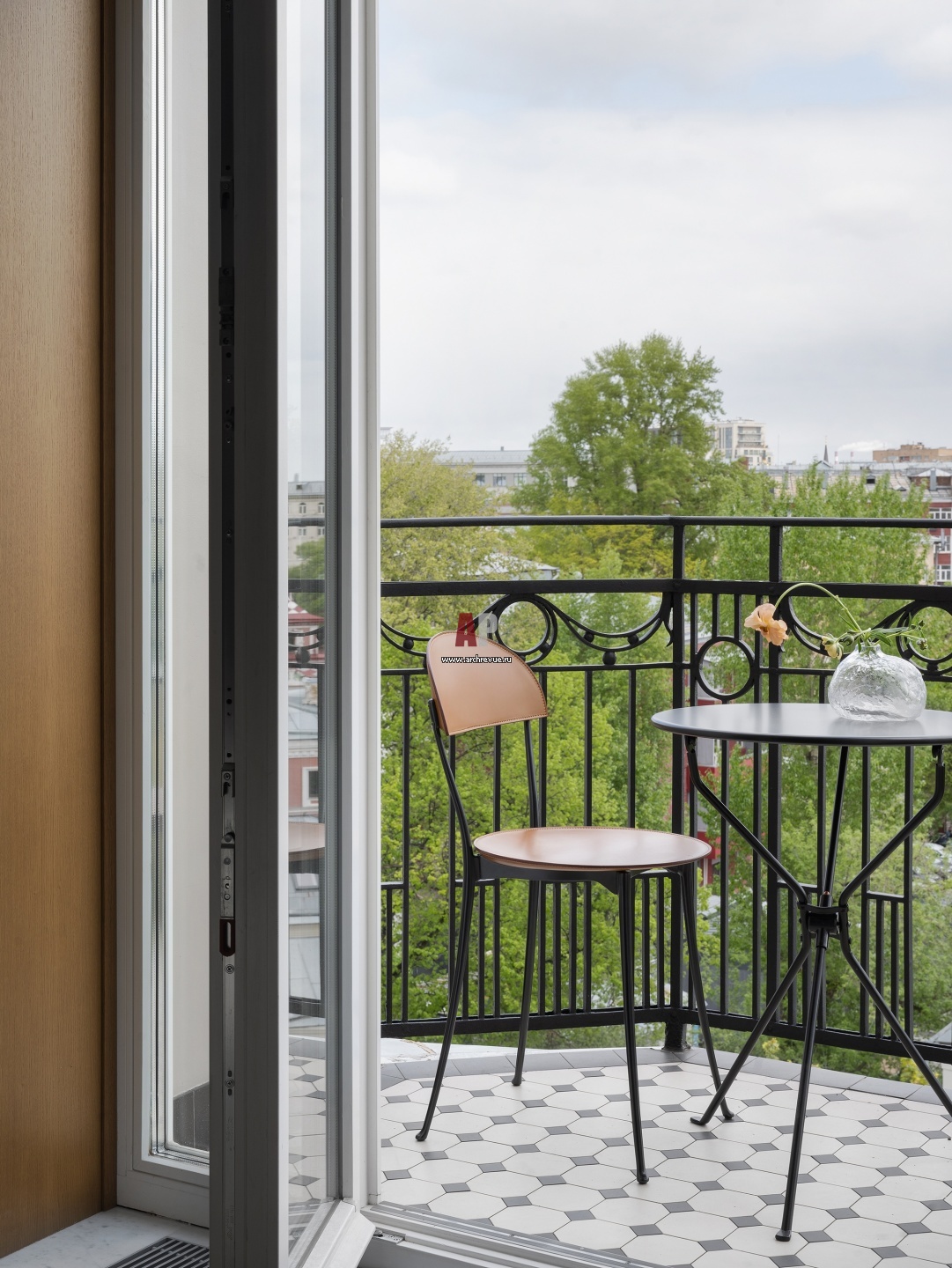 Элегантная квартира на Чистых прудах. Балкон с изящным кованым ограждением в кабинете.
