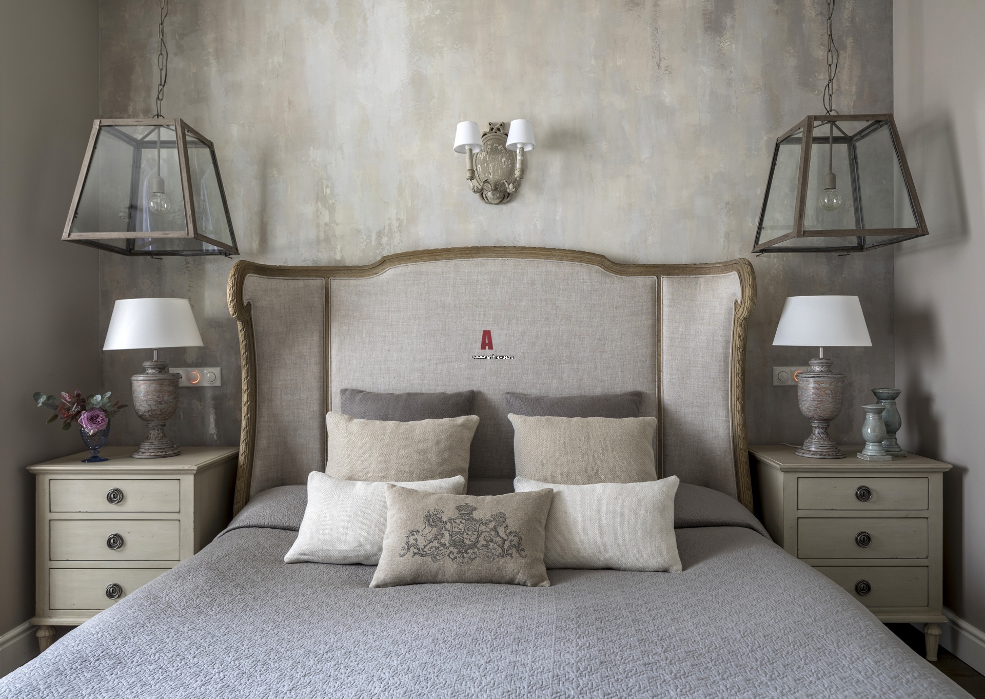 Спальня хозяев. Кровать, прикроватные тумбы, Restoration Hardware. Светильники, Eichholtz и Pomax. Декоративная роспись стен – работа Марии Вейде.
