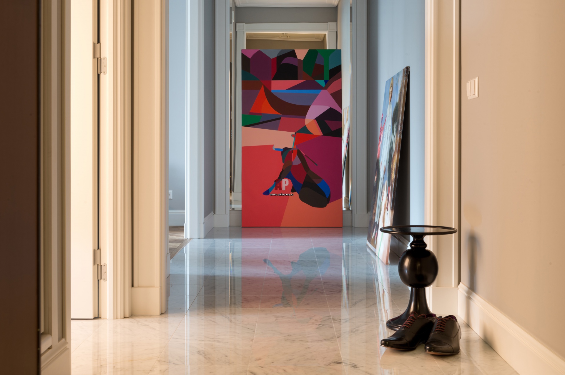 Фото прихожей. На полу – белый с серыми прожилками мрамор Statuario Venato. Табурет, Objet de Curiosité.