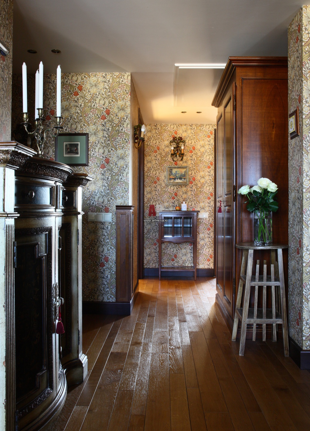 На фото – интерьер входной группы в английском стиле. Массивная мебель из темного дуба. Английские бумажные обои по дизайну Уильма Морриса.