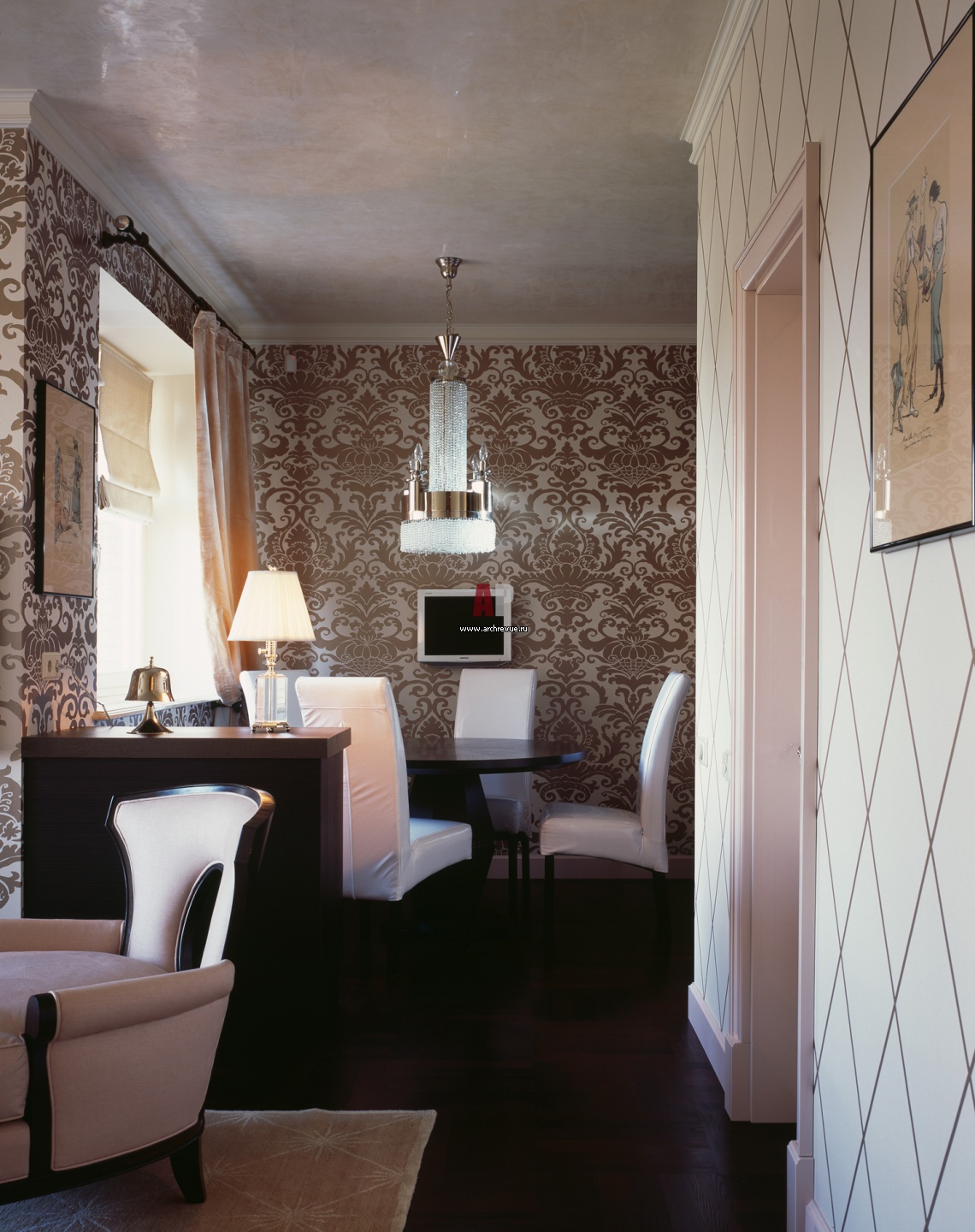 Фрагмент интерьера зоны столовой. Потолки всех помещений оформлены венецианской штукатуркой Stucco Antico. Обеденный стол акцентирован хрустальной люстрой в духе ар-деко, поставщик «Английские интерьеры».