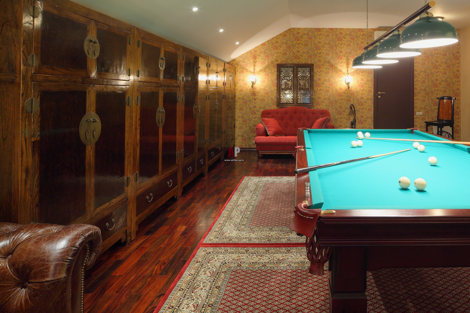 Бильярдная в мансарде. Антикварный комод привезен из Китая.