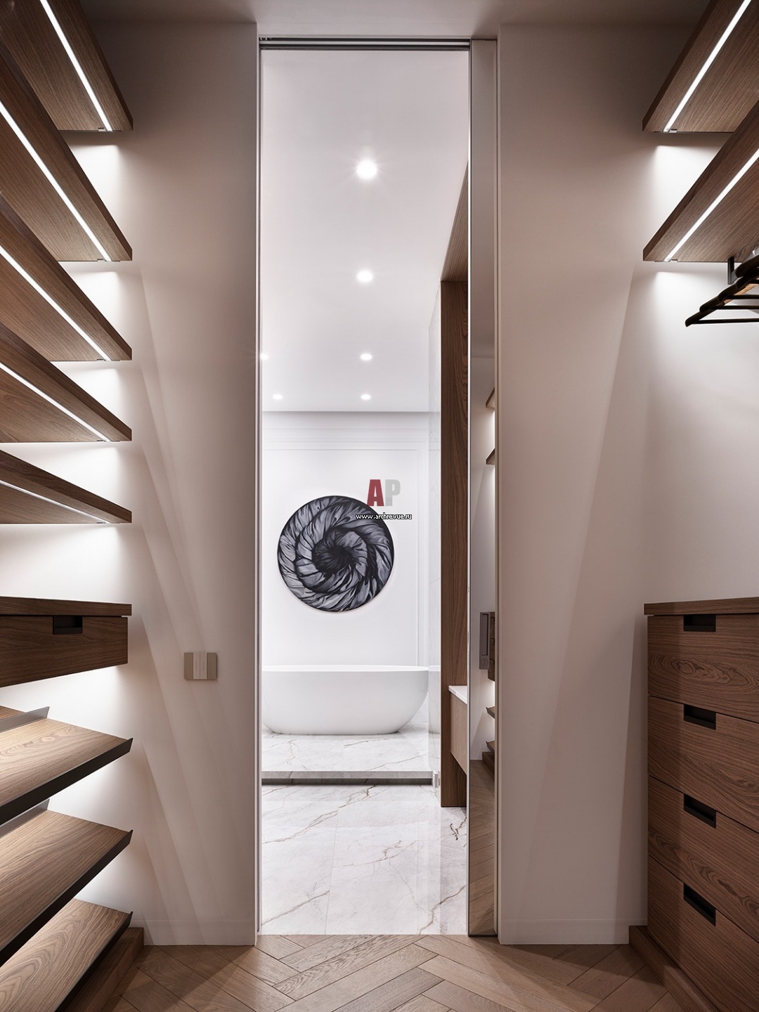 Проход из мастер-спальни в ванную комнату идет через гардеробную. Раздвижная дверь сделана зеркальной.