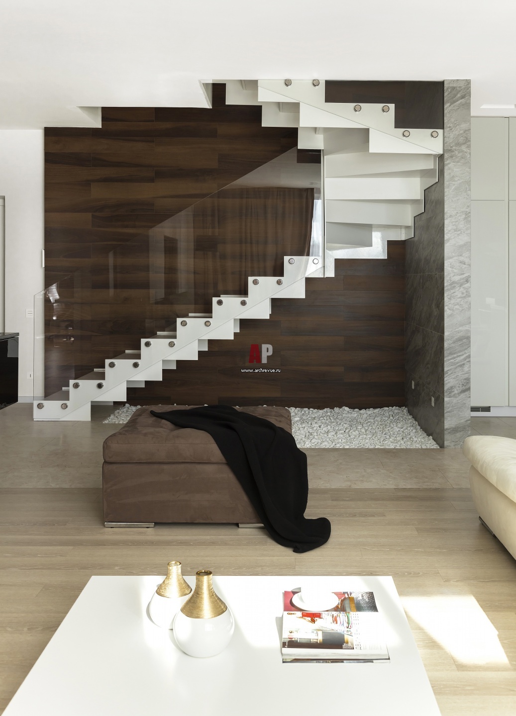Светлый двухэтажный пентхаус для семьи с тремя детьми. Интерьер гостиной с минималистичной лестницей на второй этаж.