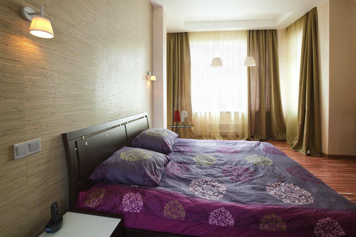 Восточный колорит спальне придают обои из натурального бамбука и яркий текстиль с вышивкой, текстильный дизайн «ИнтерДекор».
