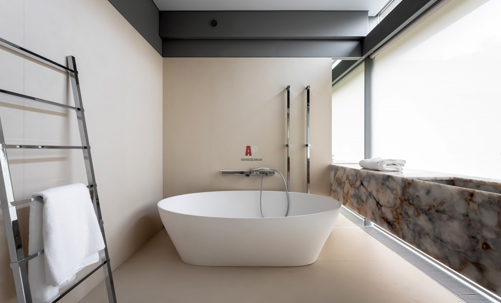 Ванная комната нам первом этаже. Пол, стены, крупноформатный керамогранит, Arch-Skin. Ванна-чаша, Antonio Lupi. Раковина сделана из натурального мрамора.